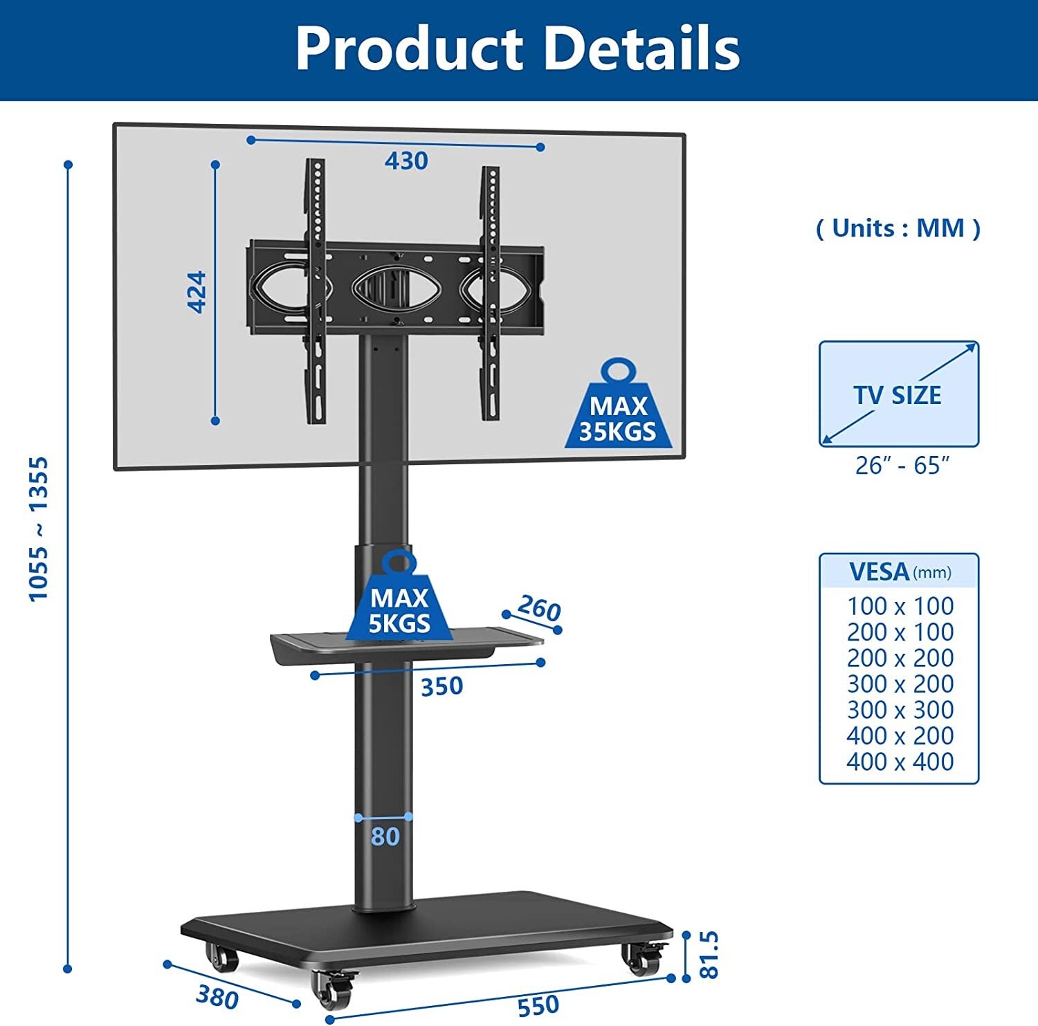 - Stabiele standaard met opslag: productafmetingen 550 (L) x 380 (B) x 1355 (H). Deze tv-rolstandaard van duurzaam staal en een houten sokkel is veiliger dan een glazen sokkel en kan tv met een gewicht van maximaal 35 kg dragen. De metalen plaat is in hoogte variabel en breed genoeg om ruimte te bieden voor je audio-video-accessoires, Blu-Ray- en dvd-speler enz.