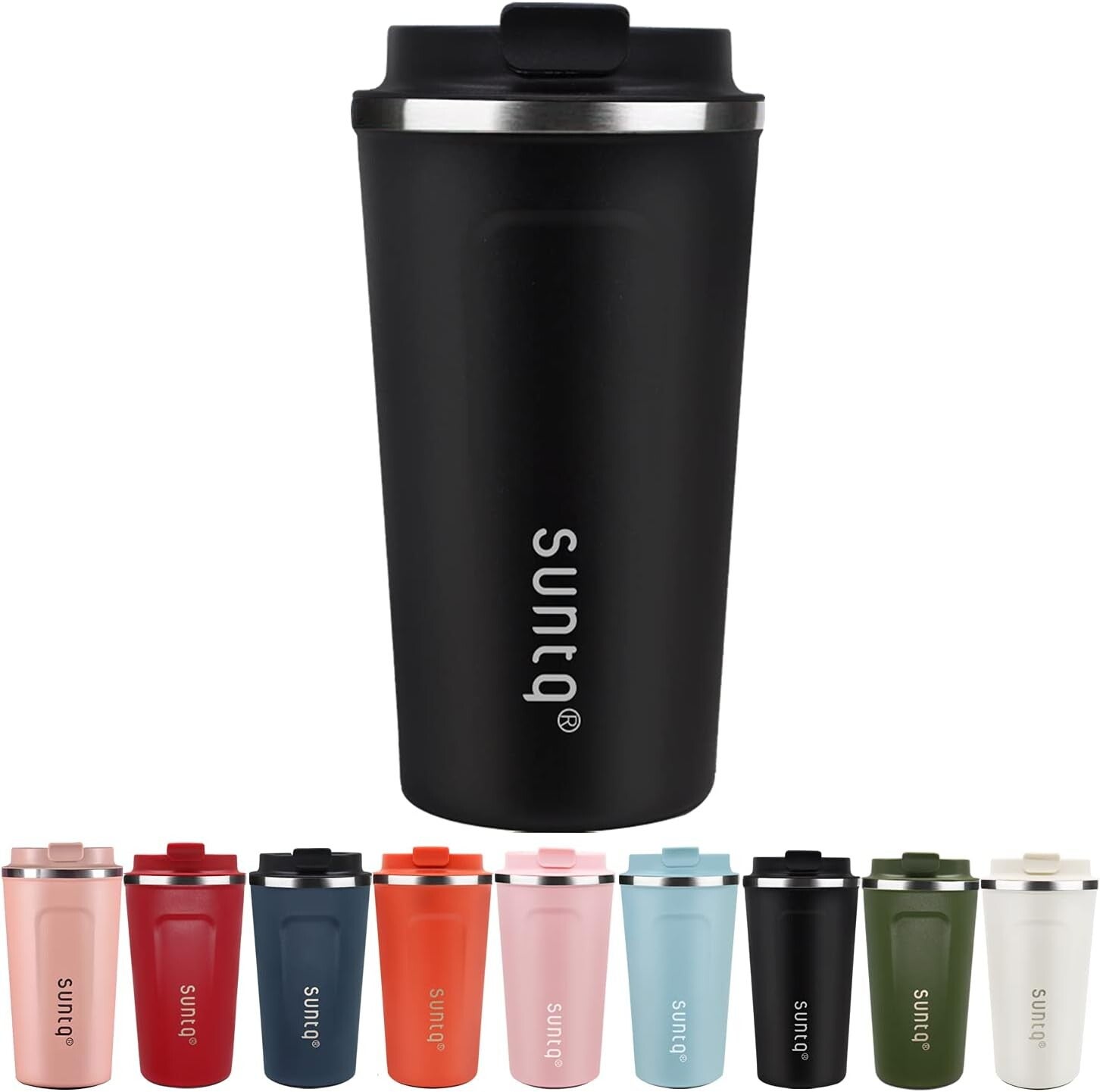 SUNTQ Koffiemok om mee te nemen, van roestvrij staal, thermobeker, dubbelwandig geïsoleerd, koffiemok met lekvrij deksel, herbruikbaar, zwart, 510 ml