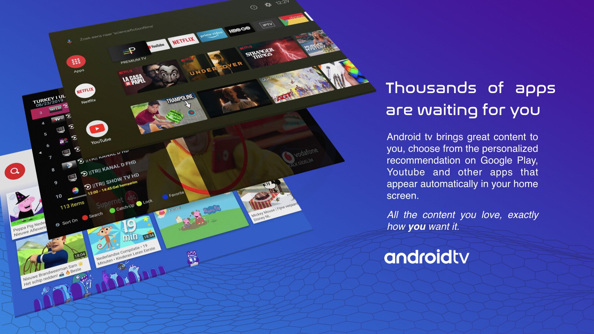 Android TV biedt u geweldige inhoud, kies uit de gepersonaliseerde aanbeveling op Google Play, YouTube en andere apps die automatisch op uw startscherm verschijnen. Alle inhoud waar u van houdt, precies zoals u het wilt.