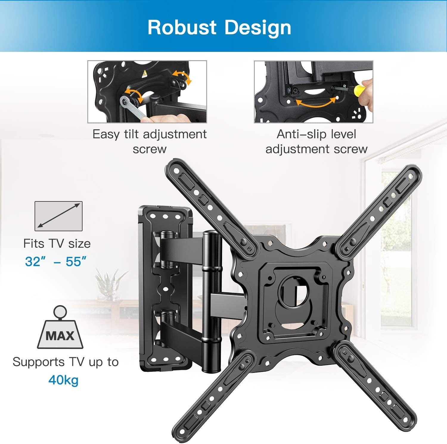 Deze scharnierende tv-muurbeugel is gebouwd met een enkele arm die slechts 3,2 inch van de muur kan worden ingetrokken voor extra gemak en uitschuift tot maximaal 19,5 inch van de muur, zodat u de meest comfortabele kijkhoek tijdens het kijken.