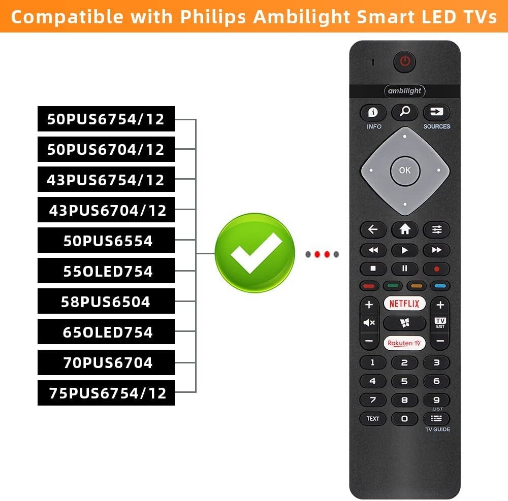 - Afstandsbediening voor Philips Ambilight 4K Smart LED TV 75PUS6754/12 65PUS6754/12 65PUS6704/12 55PUS6754/12 50PUS6754/12 50PUS6704/12 43PUS6754/12 43PUS6704/12 43PUS6554 43PUS6704 43PUS6814/12 43PUS7334 43PUS7394 50PUS047394 50PUS67044 55PUS6754 55PUS6814 55PUS6814/12 55PUS7334 55PUS7394 55PUS8804 58PUS650465OLED804 65OLED804/12 65OLED934/12 65OLED984 65PUS6504 65PUS6554 65PUS6704 65PUS6754 65PUS6814/12 65PUS7601/12 70PUS6704 70P.