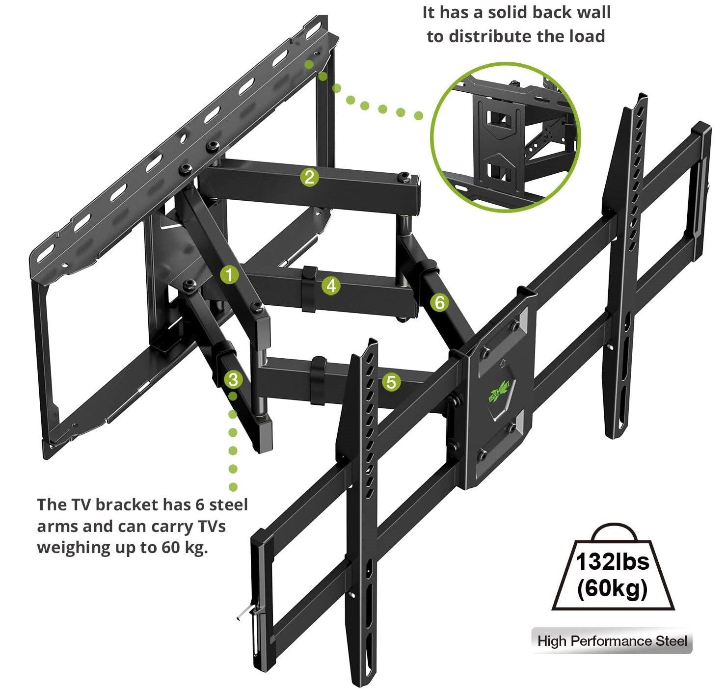 - Robuuste en veilige constructie: deze dubbele arm tv-wandhouder is robuust en bestand tegen buigingen om te voorkomen wanneer ze volledig worden uitgeschoven. Alle televisiewandhouders worden door een professionele tv-houderfabriek met meer dan 20 jaar ervaring gemaakt van robuust staal. En alle tv-houders hebben voor verzending al strenge belastbaarheidstests doorstaan. Robotlassen en hoogwaardig procesontwerp maken onze tv-muurbeugel zeer veilig.